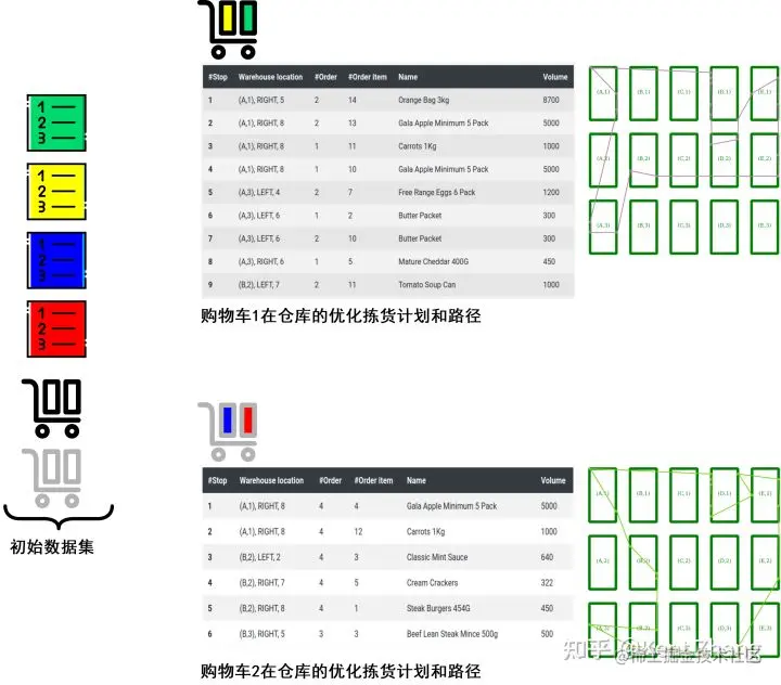 下图展示了订单拣货问题输入数据和计算拣货计划的过程: