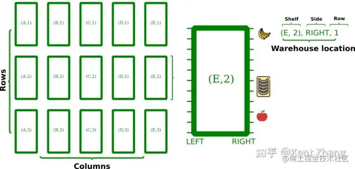 为了表述拣货问题,仓库被定义为一组按行和列组织的货架。产品位于货架的左右两侧。因此,产品的位置由货架号、行号和左右侧3个位置元素决定了产品的位置。例如下图右侧有三组位置元素:E,2 表示货架号(即每个方格),RIGHT表示货架的右侧,1表示第一行。(Kent Zhang:这个系统实为仓储的坐标,各位可按自己的仓储位置设计来定义)。