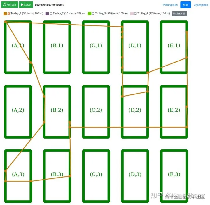 通过页面上的“Map”页签可以查看各个购物车如何根据规划结果的路径,在仓库中导航访问各个拣货点。