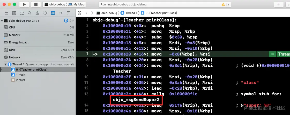 上面只是打了个断点从现象上分析了原因,但是原理是什么,并没有讲清楚。下面同汇编入手来探究一下其根本原因。在-printClass方法的第一行代码打上断点(上述代码块第5行),运行程序来到断点后,Xcode菜单->Debug->Debug Workflow->Always Show Disassembly,断点会来到汇编中: