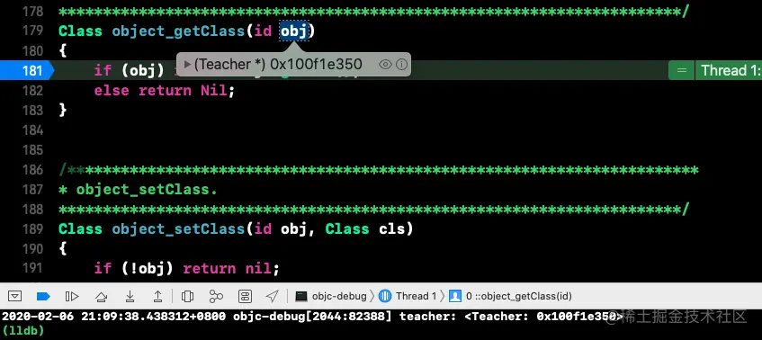2020-02-06 22:41:26.440359+0800 objc-debug[2700:130559] tc: <Teacher: 0x101e01b50>