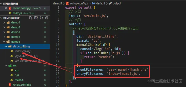 - output.chunkFileNames和output.entryFileNames选项来提供您自己的命名模式