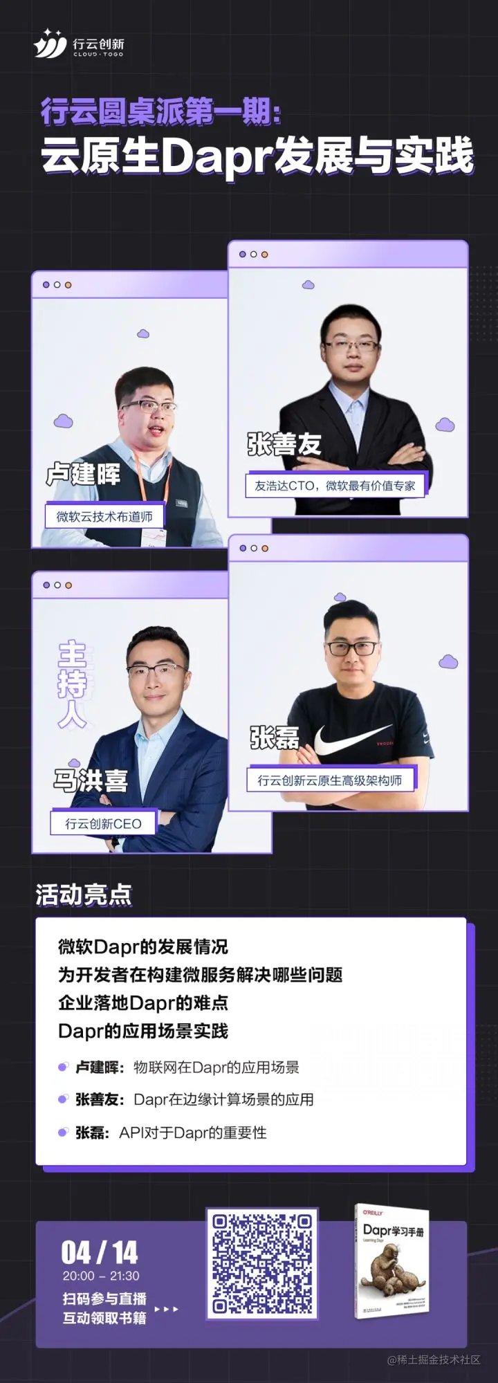 4月14日晚上8点,《行云圆桌派第一期:云原生Dapr的发展与实践》直播来啦!活动由行云创新CEO马洪喜,微软最有价值专家、.NET技术专家张善友,微软云技术布道师卢建晖,行云创新云原生架构师张磊四位嘉宾与大家聊聊Dapr的发展情况和落地遇到的问题、Dapr应用场景实践、未来展望等。