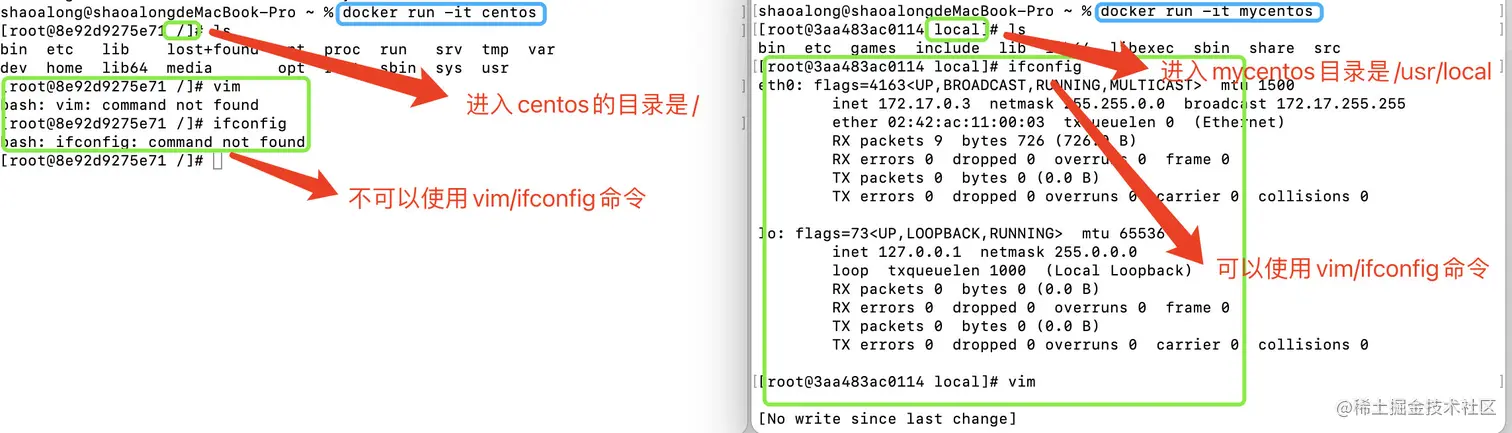 shaoalong@shaoalongdeMacBook-Pro ~ % docker ps CONTAINER ID IMAGE COMMAND CREATED STATUS ec2b942da57a centos "/bin/bash -c 'while…" 34 minutes ago Up 34 minutes shaoalong@shaoalongdeMacBook-Pro ~ % docker exec -it ec2b942da57a /bin/bash [root@ec2b942da57a /]# ls bin etc lib lost+found mnt proc run srv tmp var dev home lib64 media opt root sbin sys usr [root@ec2b942da57a /]# ps PID TTY TIME CMD 2071 pts/0 00:00:00 bash 2102 pts/0 00:00:00 ps [root@ec2b942da57a /]# ps -ef UID PID PPID C STIME TTY TIME CMD root 1 0 0 08:37 ? 00:00:02 /bin/bash -c while true;do echo root 2071 0 0 09:11 pts/0 00:00:00 /bin/bash root 2107 1 0 09:12 ? 00:00:00 /usr/bin/coreutils --coreutils-p root 2108 2071 0 09:12 pts/0 00:00:00 ps -efdocker attach 容器id bashShell