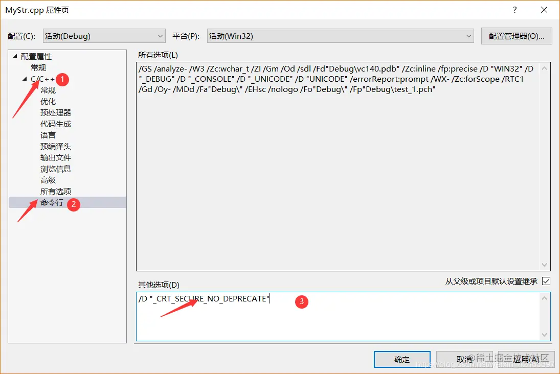 VS中错误:'strcpy': This function or variable may be unsafe. GallagherZ 2022-04-08 267 阅读1分钟 本文已参与「新人创作礼」活动,一起开启掘金创作之路 step1:打开报错误的工程 step2: step3:将 /D "_CRT_SECURE_NO_DEPRECATE" 复制到如图中