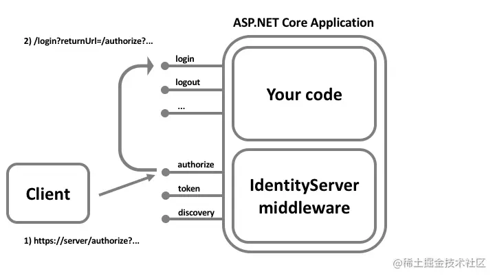 当IdentityServer在授权端点收到请求且未对用户进行身份验证时,将用户重定向到已配置的登录页面。 必须通过选项上的UserInteraction设置(默认/account/login)通知IdentityServer登录页面的路径,将传递returnUrl参数,通知登录页面,一旦登录完成,应该重定向用户。
