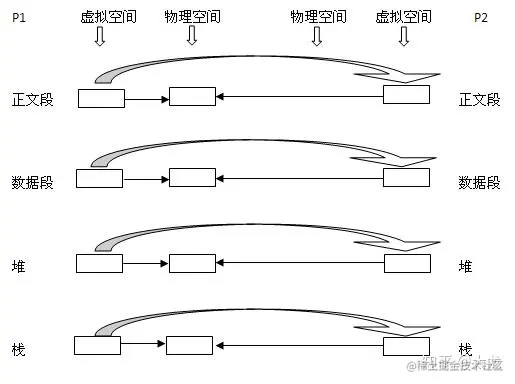 更具体地讲,我们知道每个进程的虚拟空间是被划分成正文段,数据段,堆,栈这四个部分,同时对应于每一个部分,操作系统会为之分配真实物理块。当我们从父进程P1中fork出一个子进程P2时: