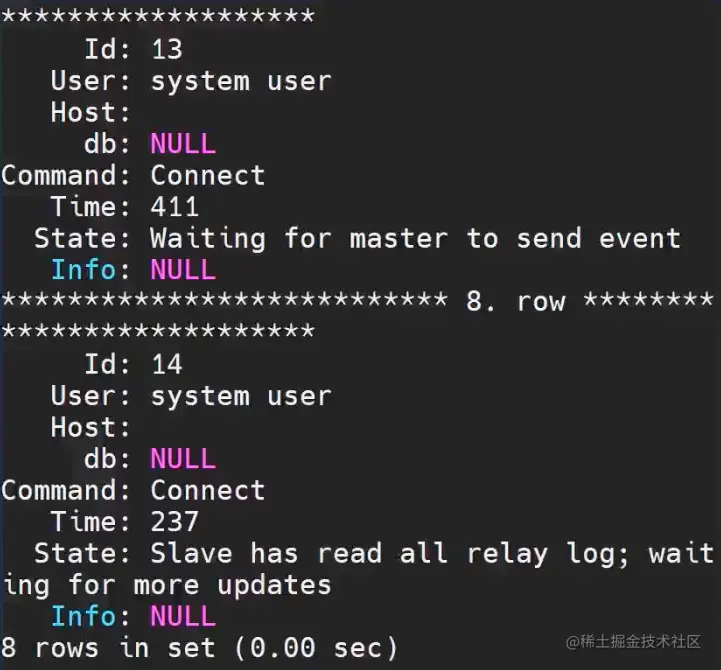 从节点有两个线程,也可以通过show processlist方法查看IO现场和重放relay log的两个线程。