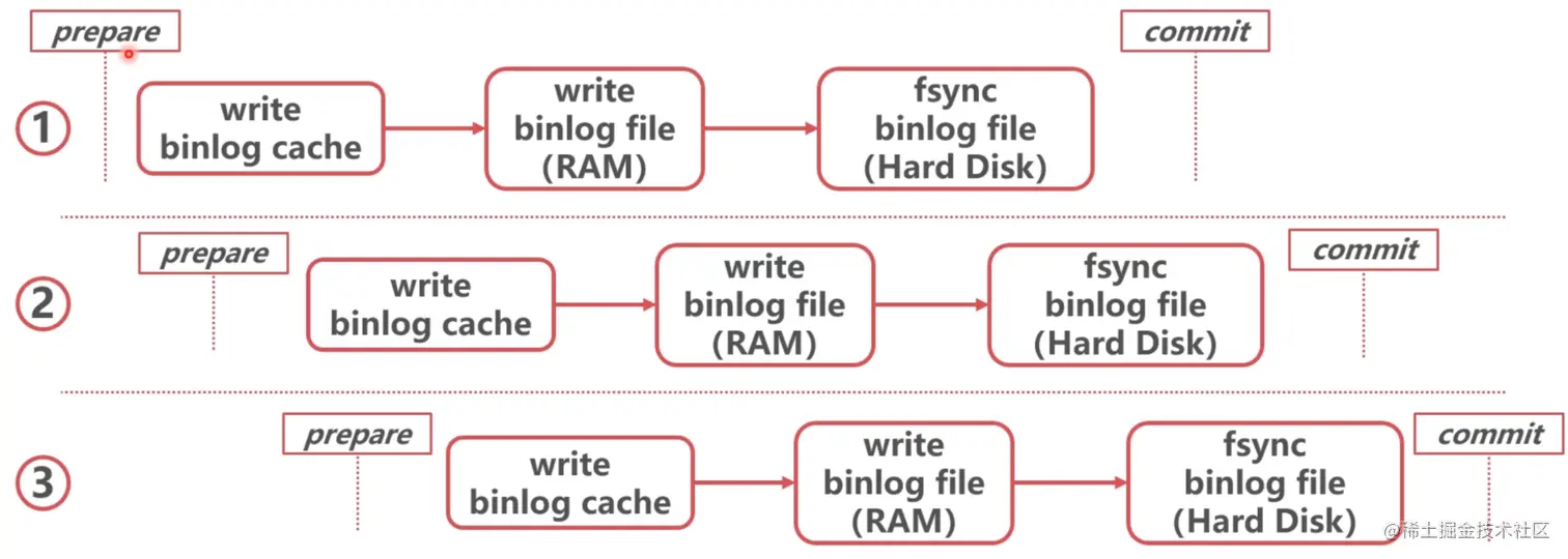 在介绍具体的策略之前,需要解释一下主库对于binlog刷盘的原理,binlog 刷盘分为两步动作,通过这两步动作之后,由此主库的binlog多线程访问,对于多线程事务的提交就可以进行并行刷盘的操作:
