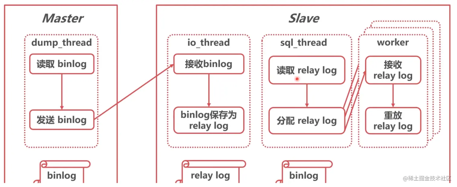 从库会通过sql线程定时读取最新的relay log文件,对于relay log重放,重放之后自己再记录一次binlog日志。(自己再记录一次主要是因为从库本身也有可能是其他子从库的主库,整个过程按照相同的步骤处理)