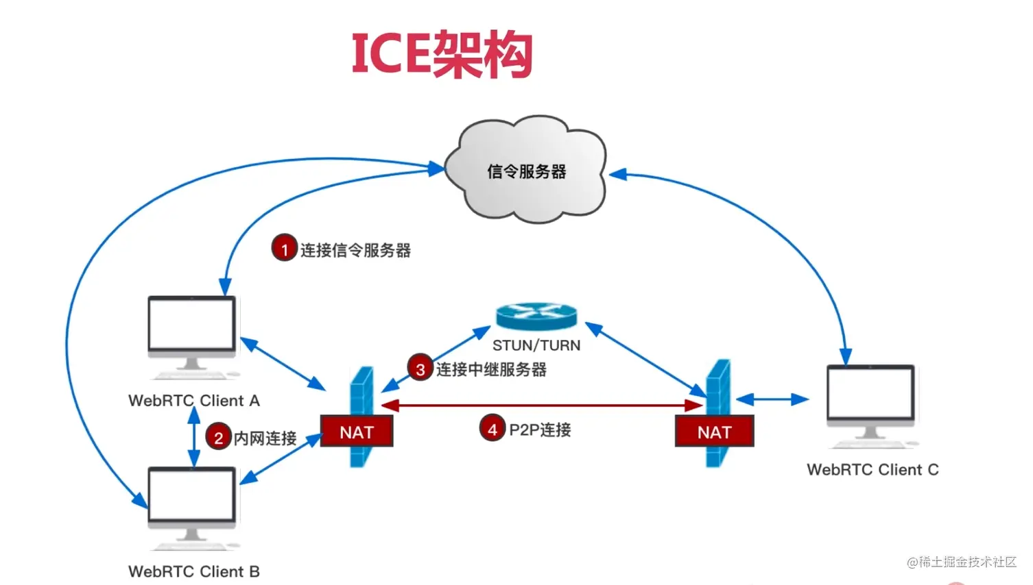 ICE规范中 必须要有一个信令服务器, 但是信令服务器使用的协议不属于ICE规范, 用户可以自己选择UDP / TCP 等协议