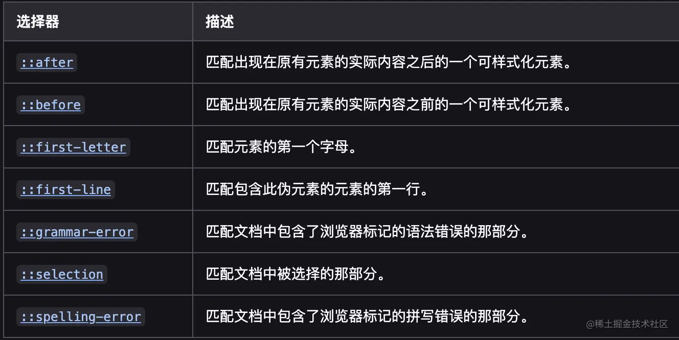 “::”,表示无法用html语义表达的实体/匹配处于相关的确定位置的一个或多个元素