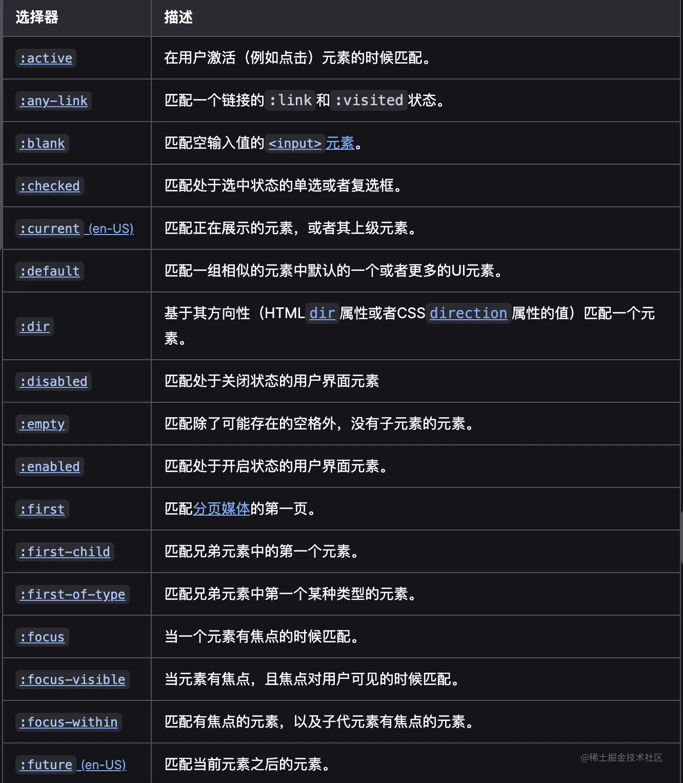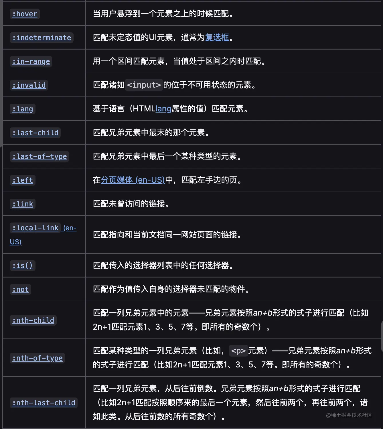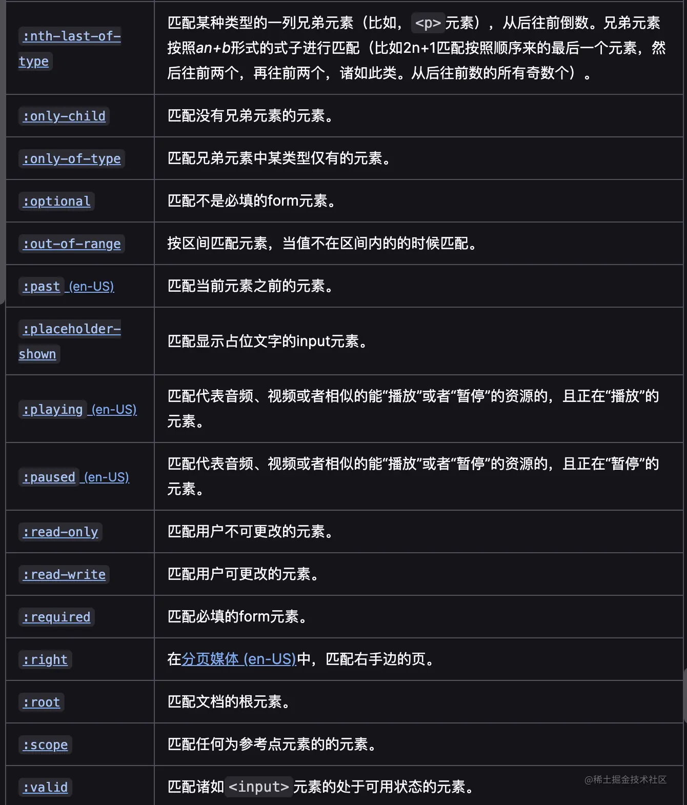 w3c官方文档:www.w3.org/TR/selector… 这里有对所有伪类进行分类与举例说明
