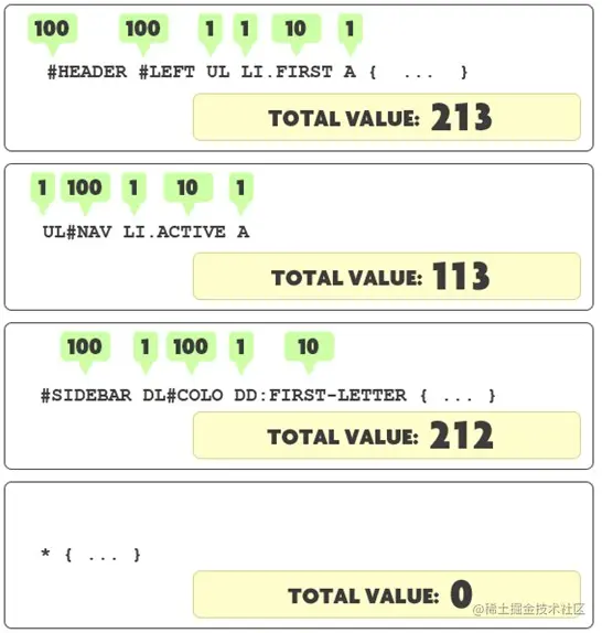 选择器权重越高,优先级越高。