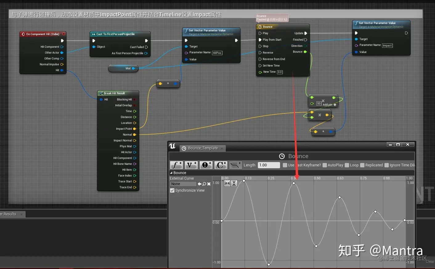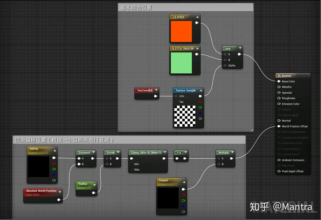 要实现上面的效果需要材质和蓝图两个部分,核心在材质。基本的制作思路是从交互点(如子弹射击的点或者用刀枪砍的点)对物体顶点进行有规律的衰减偏移,那么交互点从哪里来呢