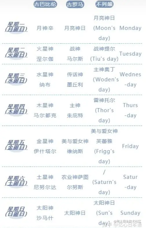 后来犹太人将其传到了古埃及,又由古埃及传到了古罗马,古罗马人用他们自己信仰的神的名字来命名1周7天。这些名称传到不列颠后,盎格鲁—撒克逊人又用他们信仰神的名字改造了其中4个: