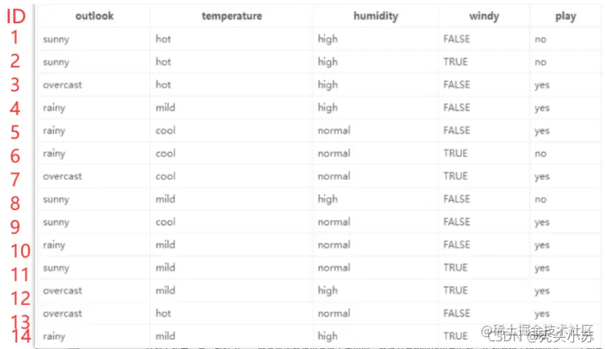 根据这个思想,我们举一个实例来说明。下表为根据outlook,temperature,humidity,