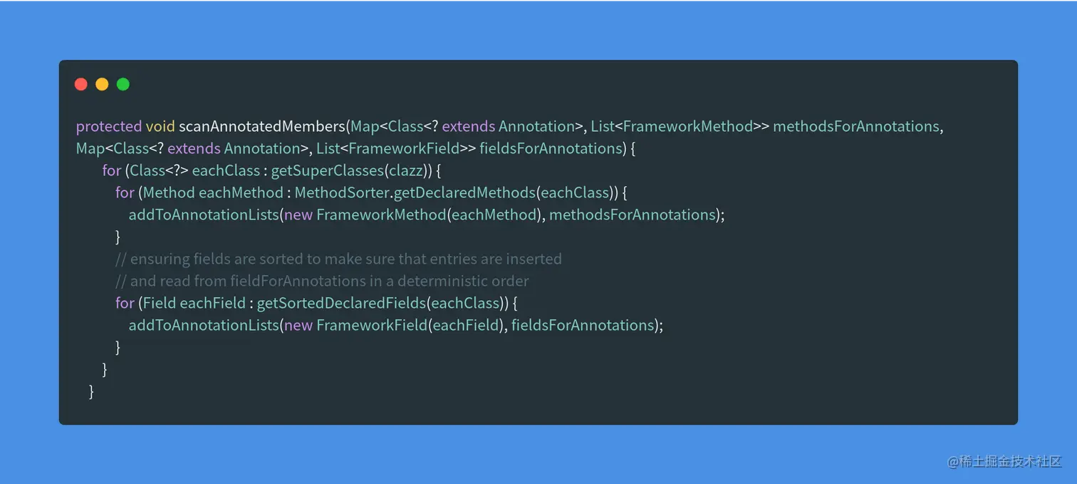 通过scanAnnotatedMembers方法扫描方法和属性,来构建FrameworkField和FrameworkMethod