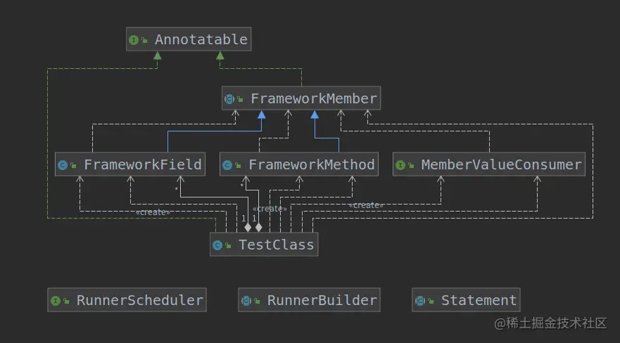 TestClass调用了FrameworkField、FrameworkMethod两个类和MemberValueConsumer接口