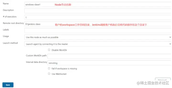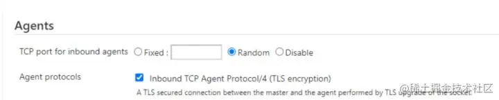 需要注意 Launch method 一定要开启 jenkins 的远程连接端口,否则 slave 从机无法连接上 Jenkins 服务。这种连接用的是 JNLP4 协议, 这种协议是在 WebSocket + TLS 的基础上封装而成的长连接协议。可以在 jenkins 的安全设置面板中开启:进入 Jenkins 首页-> 安全面板