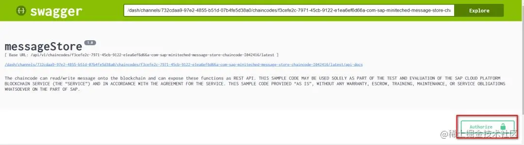 该控制台集成了 Swagger 框架,在调用 post 请求进行超级账本的写操作和 get 请求进行读操作之前,先要点击 Authorize 按钮进行身份认证: