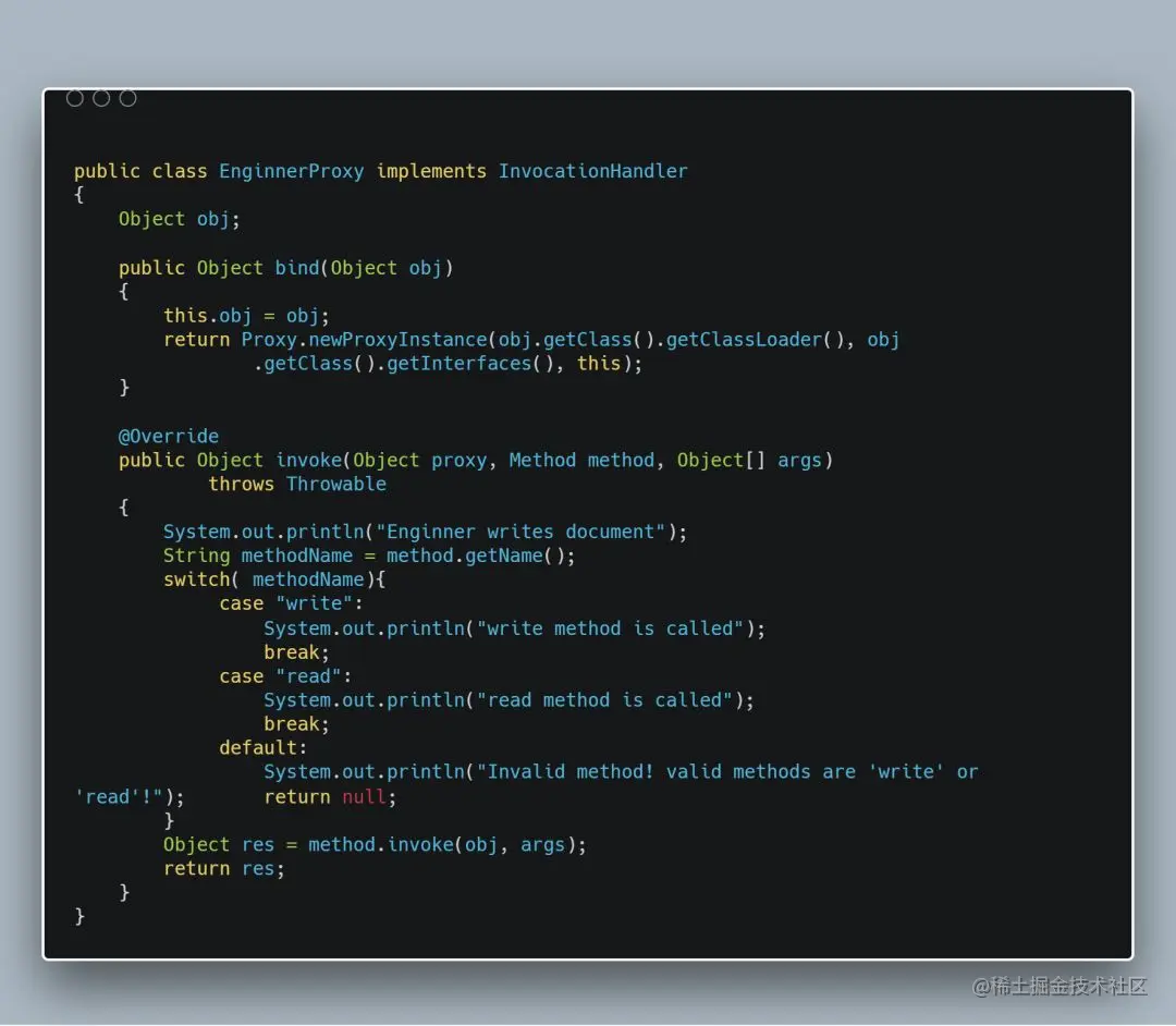 这种通过同一个回调函数内部的 switch case 来处理多个场景的做法,ABAP 和 Java 开发者应该都不陌生。比如下图是通过 InvocationHandler 实现 Java 动态代理的例子,其中 invoke 方法的逻辑结构和本文智能合约代码的结构非常相似。