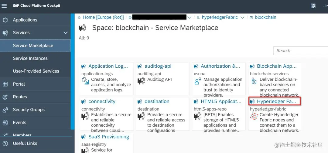 - 登录 SAP 云平台,在 Service Marketplace 里点击 Hyperledger Fabric 的超链接: