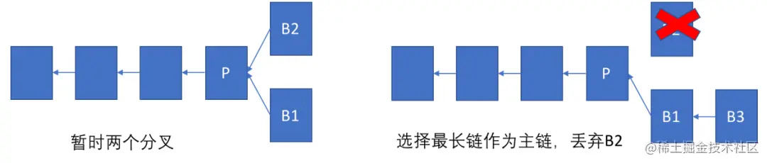 当节点计算出一个符合难度的区块哈希时,即说明该矿工挖矿成功了,该节点将该区块组装到本地的区块链,同时也将此区块广播给其他节点。其他节点接收到该区块后会验证该区块是否有效,有可能有两个节点同时挖出了新的区块 B1 和 B2,它们的上一个区块都是同一个区块 P。有的节点可能会先收到 B1,有的会先收到 B2,这时区块链出现了暂时性的两个分叉。要打破这种局面,要看下一个区块是基于 B1 生成还是基于 B2 生成。如果基于 B1,B1 这条链就变成了最长链,其他包含 B2 的节点会重新选择最长链,而 B2 作为孤块被丢弃掉。