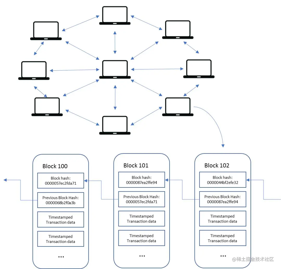 账本的数据结构就是这样的一个链表,那么分布式的含义是什么呢?