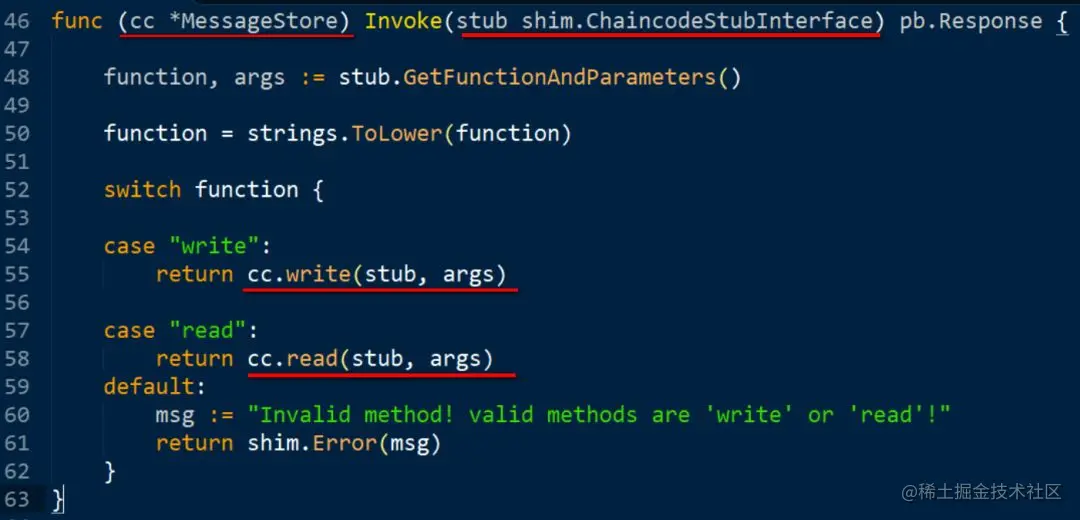 第46行定义的方法 Invoke 是这个最简单的智能合约的核心代码,cc *MessageStore 这个语法和 C 语言很像,定义了一个类型为 MessageStore 的指针变量 cc。这个指针变量同 C++ 的 this 指针和 ABAP 的 me 引用作用类似,在方法被调用时,指向了方法的调用者。