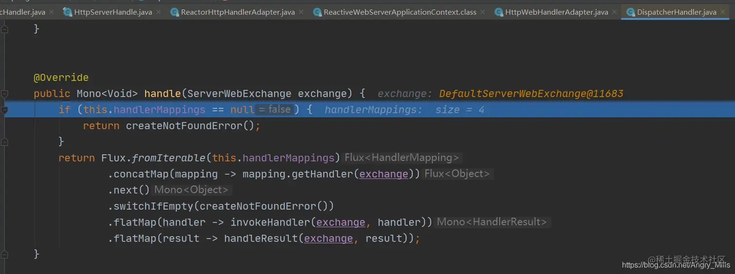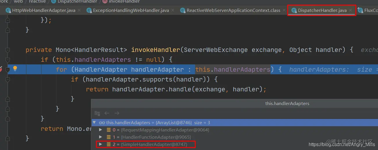 之后进去 Dispatcherhandler.handle ,这里边会有3个操作,获取路由(getHandler)、请求路由(invokeHandler)、解析结果(handleResult)