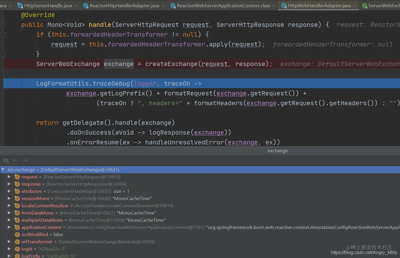 HttpWebHandlerAdapter.apply ,包装模式,request 和 response,继续执行 handle方法,生成 exchange 对象,将 request ,response 还有其他的 attribute 封装到一个对象