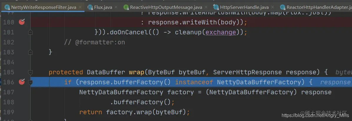 会判断响应的 content-type 是流还是其他的,如果是流的话,写入并刷新。这个地方看一下 wrap 方法,我找了半天都没有找到 gateway 在哪保存的第三方服务的返回值,就在这个byteBuf,封装 DataBuffer,设置到 DataBufferFactory,和 response 绑定。