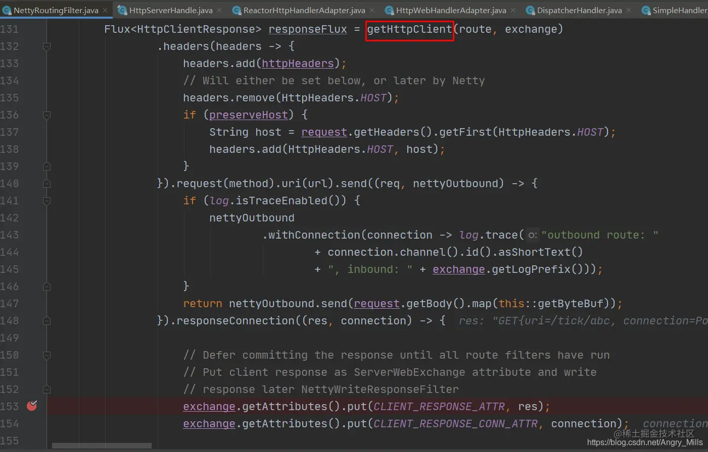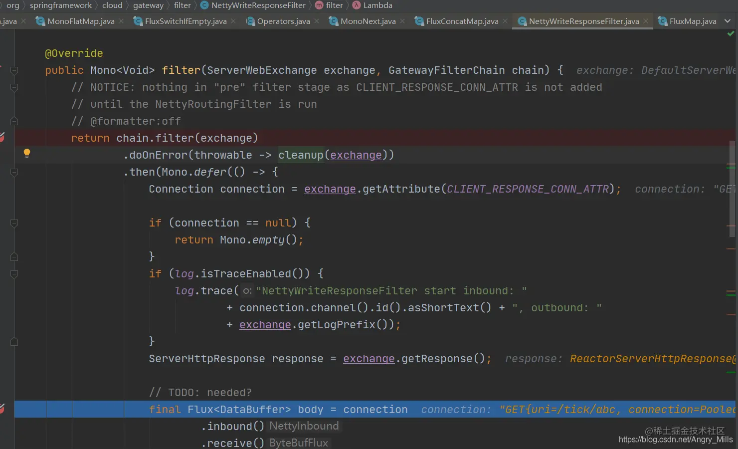 NettyRoutingFilter.filter 就是发送http请求,调用第三方服务,对response 请求头过滤处理,将response 封装到 Mono