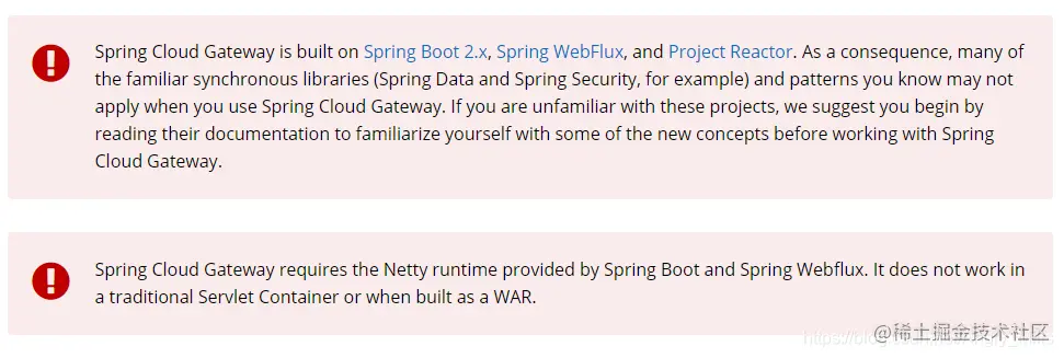 看一下官方这段说明,gateway 使用的是 webflux 和 reactor,有一些同步的包(data,security 可能不支持)。