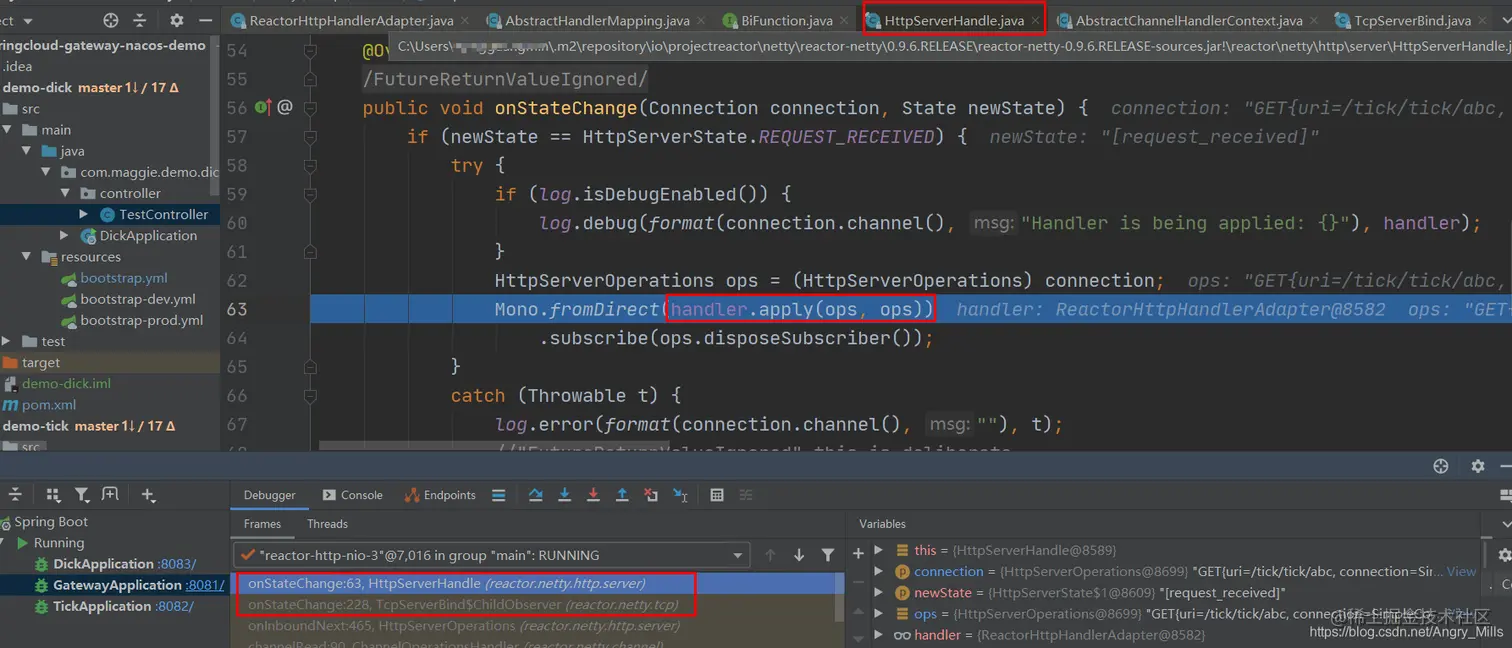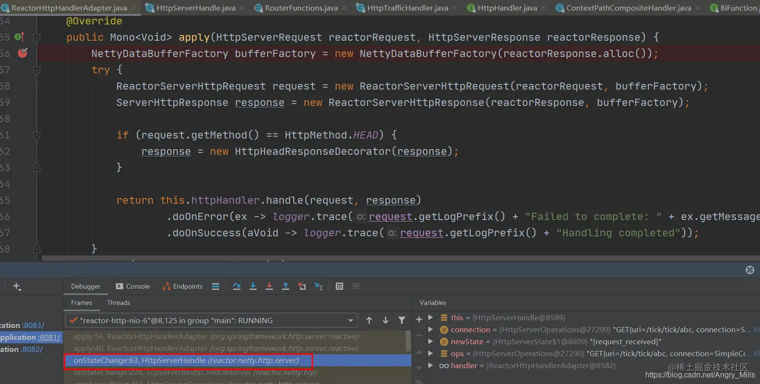 看了网上一些资料,从 ReactorHttpHandlerAdapter.apply 开始,debug 看看从哪发起的。