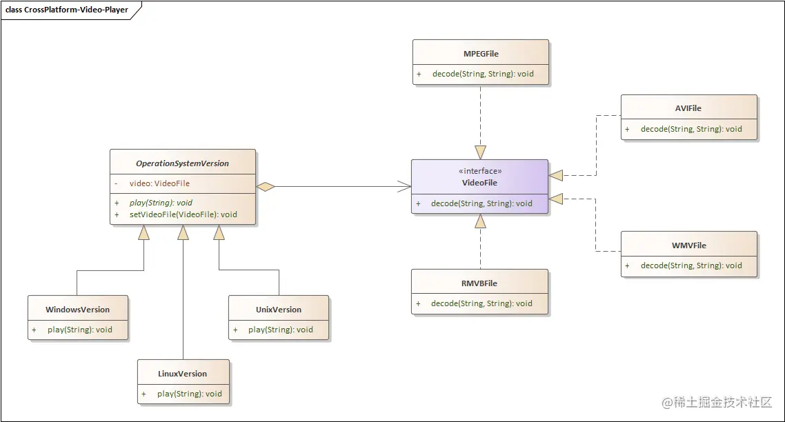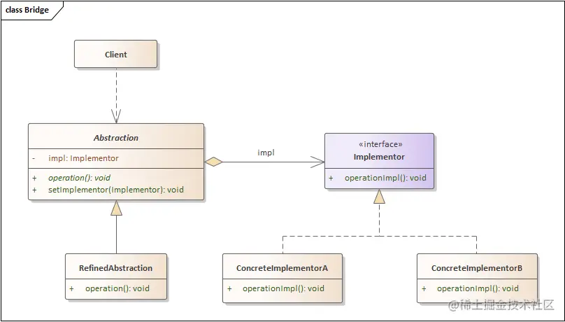 设计模式四人组在桥接模式中提出了抽象部分与实现部分两个术语,它们与编程语言中的接口或抽象类无关。