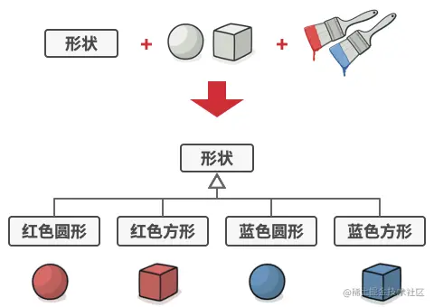如果我们有一个几何类 Shape,从它可以扩展出两个子类圆形 Circle 与正方形 Square,然后你希望在此之上进行扩展,使其包含颜色,所以就创建了红色 Red 类与蓝色 Blue 类,由于系统中有两个几何子类,所以你总共需要创建 2 x 2 个子类(RedCircle、BlueCircle、RedSquare、BlueSquare)才能覆盖所有组合。