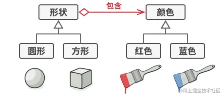 ⚡抽象对象控制着实体的形状,并将颜色相关的工作委派给连入的实现对象。