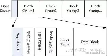 Linux正统的文件系统(如ext2、3等)将硬盘分区时会划分出超级块、inode Table区块和data block数据区域。一个文件由一个超级块、inode和数据区域块组成。Inode包含文件的属性(如读写属性、owner等,以及指向数据块的指针),数据区域块则是文件内容。当查看某个文件时,会先从inode table中查出文件属性及数据存放点,再从数据块中读取数据。
