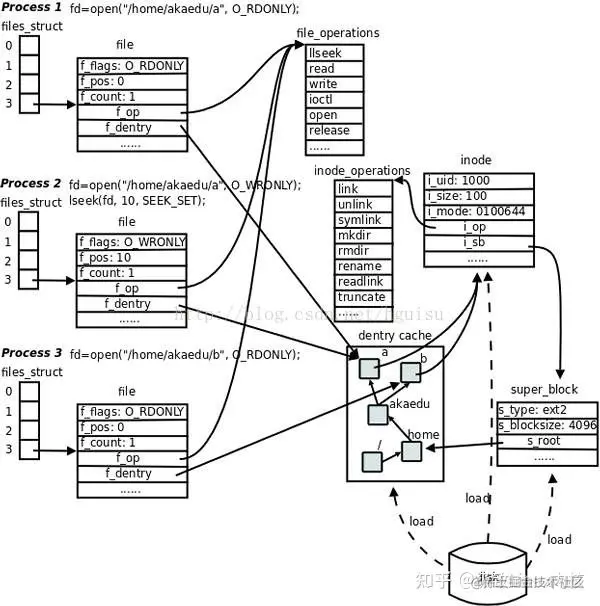 每个file结构体都有一个指向dentry结构体的指针,“dentry”是directory entry(目录项)的缩写。我们传给open、stat等函数的参数的是一个路径,例如/home/akaedu/a,需要根据路径找到文件的inode。为了减少读盘次数,内核缓存了目录的树状结构,称为dentry cache,其中每个节点是一个dentry结构体,只要沿着路径各部分的dentry搜索即可,从根目录/找到home目录,然后找到akaedu目录,然后找到文件a。dentry cache只保存最近访问过的目录项,如果要找的目录项在cache中没有,就要从磁盘读到内存中。