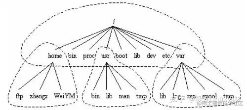 完整的目录树可划分为小的部分,这些小部分又可以单独存放在自己的磁盘或分区上。这样,相对稳定的部分和经常变化的部分可单独存放在不同的分区中,从而方便备份或系统管理。目录树的主要部分有 root、/usr、/var、/home 等(图2) 。这样的布局可方便在 Linux 计算机之间共享文件系统的某些部分。