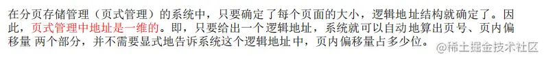 页面的划分完全是一种系统硬件的行为,一个逻辑地址放到这种地址结构中,自然就分成了页号和页内单元号两部分。