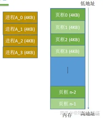 操作系统以页框为单位为各个进程分配内存空间。系统自动地将作业的地址空间分页,将系统的主存空间分块,页与块等大小,在作业运行时,一次性把作业的全部页面装入内存,各个页所占的内存块可以不连续,也不必按先后顺序,可以放到不相邻的各个页框中。
