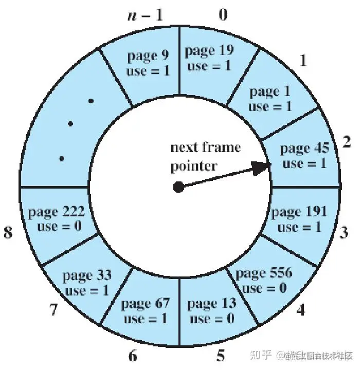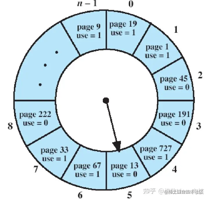 该算法首先检测指针所指的页面,如果它的访问位为0,则淘汰该页,新装入的页插入到此位置,然后指针前进一个位置;如果它的访问位为1,则清除为0,并将指针前进一个位置,继续检查访问位。重复此过程,直到找到访问位为0的页面为止。