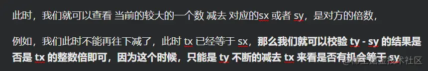 此时,我们就可以查看 当前的较大的一个数 减去 对应的sx 或者 sy,是对方的倍数,