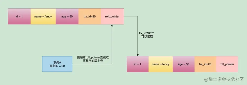 那么还有什么字段此时也会被修改吗?没错,就是我们刚刚提到的,Undo Log的另一个隐藏字段:roll_pointer指针。它会去指向被事务A修改之前的版本,也就是fancy的年龄还是28时候的地址,就为了用来记录,方便下次被查询: