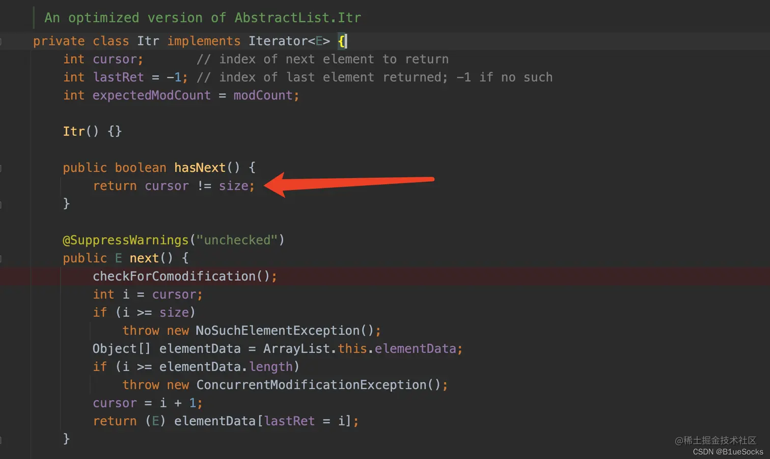 直观上看,只要这个删除操作后满足hasNext() == false,也即是cursor!=size为false,则cursor==size时,循环退出,那么自然就无法检测到这个数据的结构被修改了,自然也不会抛出checkForComodification的异常了。remove操作时数组的size会递减,--size,而next中的游标cursor的赋值为cursor = i+1。继续推导可以得到i+1=--size,恰好是倒数第二个元素。是不是这样呢?测试一下: