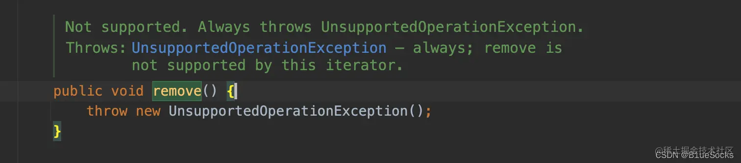 在CopyOnWriteArrayList中Iterator<E>的实现类为COWIterator<E>并且其规定了,作删除操作时直接抛出异常: