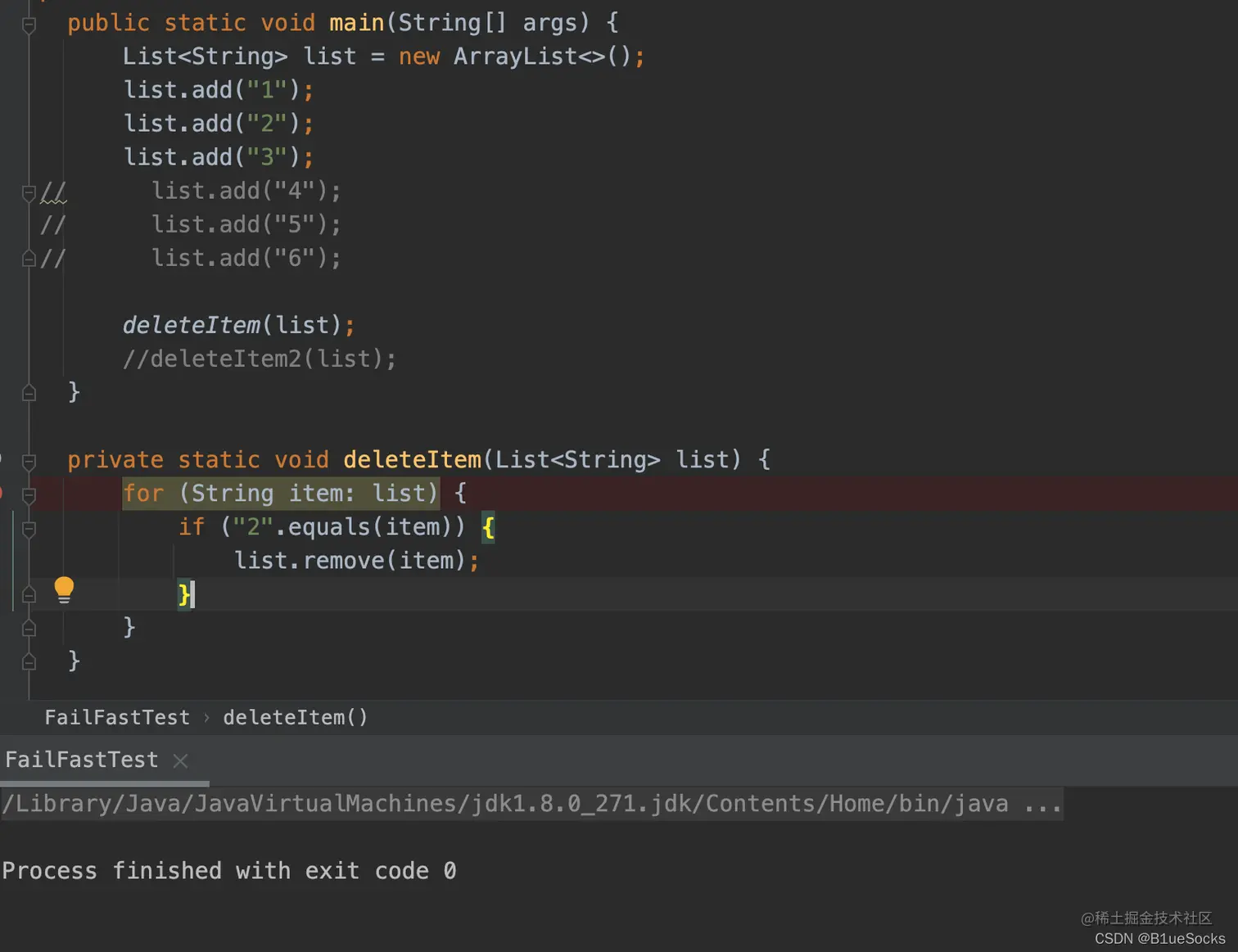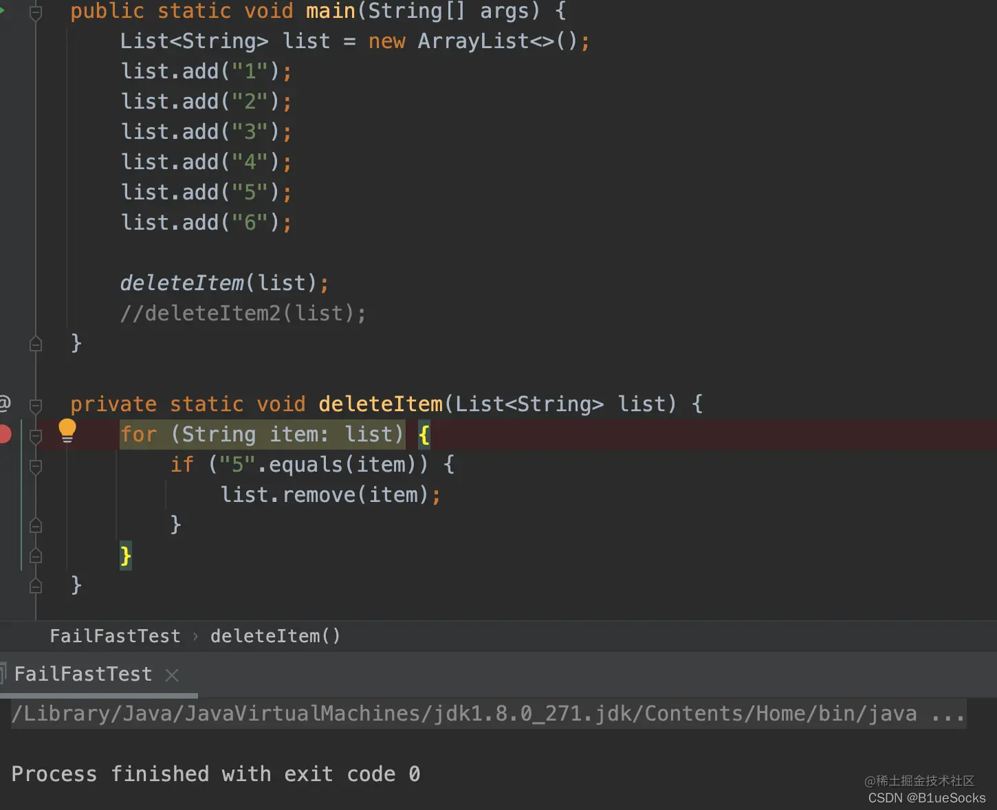 可以发现在增强for循环中调用remove方法,不会发生任何异常,但是在方法deleteItem3中,直接抛出异常: